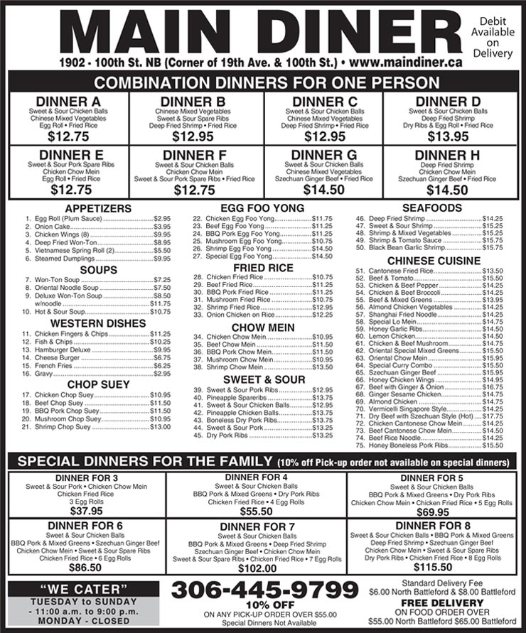 Main Diner Restaurant has a menu with over 75 items. Choose a combo dinner for yourself or a special dinner for your family to feed up to six, a great way to sample a variety of tasty dishes. Start your meal with an egg roll and plum sauce or an onion cake. Try our won ton, Oriental noodle, or other soups. We also have chop suey, egg foo young, fried rice, chow mein, and seafood dishes. Our chefs make ribs and chicken balls with sweet and sour sauce. Our Chinese cuisine includes delicious house recipes for lemon chicken, curry combo, almond chicken, Vermicelli Singapore Style, and much more. Our Western dishes include chicken fingers, fries, fish and chips, and burgers. Browse our full menu below.